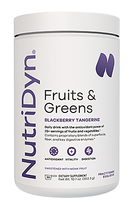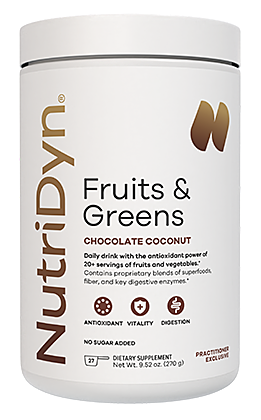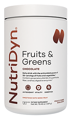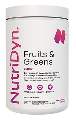 NutriDyn Fruits & Greens is an easy-to-mix, great tasting, nutrient-rich superfood formula with whole food concentrates designed to provide synergistic phytonutrient nutrition. It provides a super blend of 100% natural fruit and vegetable extracts, vitamins, enzymes, and symbiotic intestinal flora— high in antioxidants, lignans, and phytonutrients.
